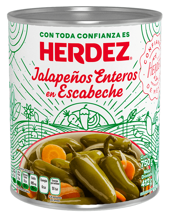 Los tradicionales chiles jalapeños en rajas de HERDEZ® están elaborados con cosechas de alta calidad en sus presentaciones 220g, 380g y 2.8Kg.